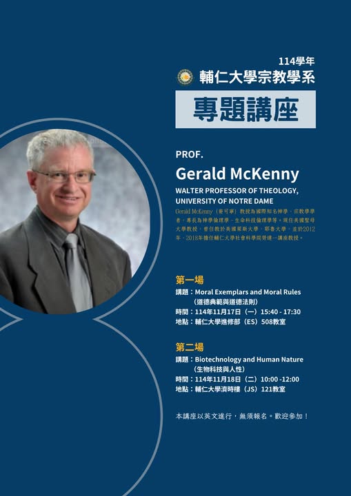 【演講】Moral Exemplars and Moral Rules(道德典範與道德法則)、Biotechnology and Human Nature(生物科技與人性) 日期|114年11月17日(一) 時間|下午15:40-17:30 地點|輔仁大學進修部大樓508教室 日期|114年11月18日(二) 時間|上午10:00-12:00 地點|輔仁大學濟時樓一樓121教室 More info 專題演講