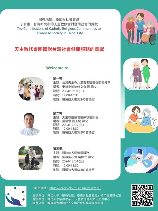 【演講】宗教地景、療癒與社會實踐學術演講系列 我們很榮幸邀請到天主教修會的多位專家來分享他們在醫療和社會服務中的寶貴經驗,特別是關於靈性關懷、病患照護等方面的心得。 這次的系列講座將探討天主教修會對台灣社會健康服務的貢獻,歡迎有興趣的朋友們報名參加! More info 專題演講