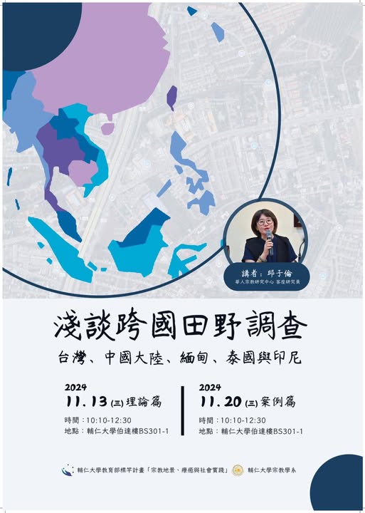 【演講】淺談跨國田野調查:台灣、中國大陸、緬甸、泰國與印尼 講題:淺談跨國田野調查:台灣、中國大陸、緬甸、泰國與印尼 講者:邱子倫 博士 (政治大學華人宗教研究中心客座研究員) 時間:11月13日&20日(三) 10:10-12:30 *連續兩週* 地點:伯達樓 BS3011 More info 專題演講