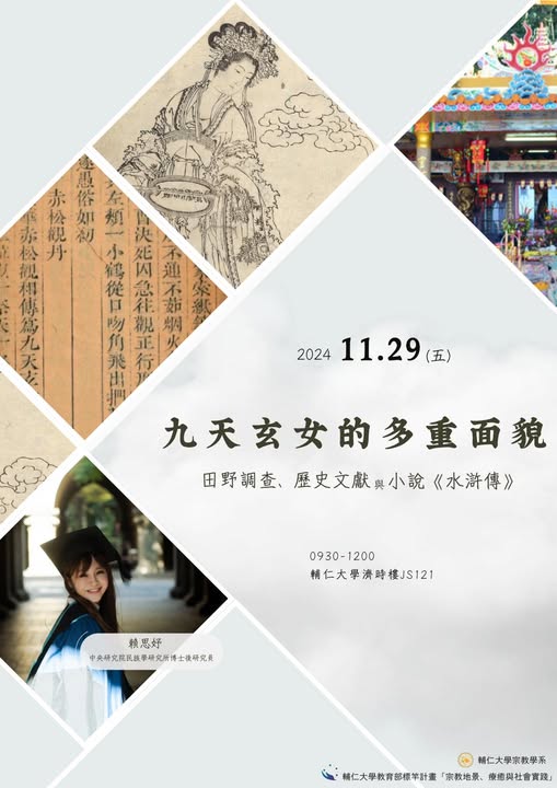 【演講】九天玄女的多重面貌:田野調查、歷史文獻與小說《水滸傳》 講題:九天玄女的多重面貌:田野調查、歷史文獻與小說《水滸傳》 講者:賴思妤博士 (中央研究院民族學研究所博士後研究員) 時間:11月29日(五) 09:30-12:00 地點:濟時樓JS121 More info 專題演講