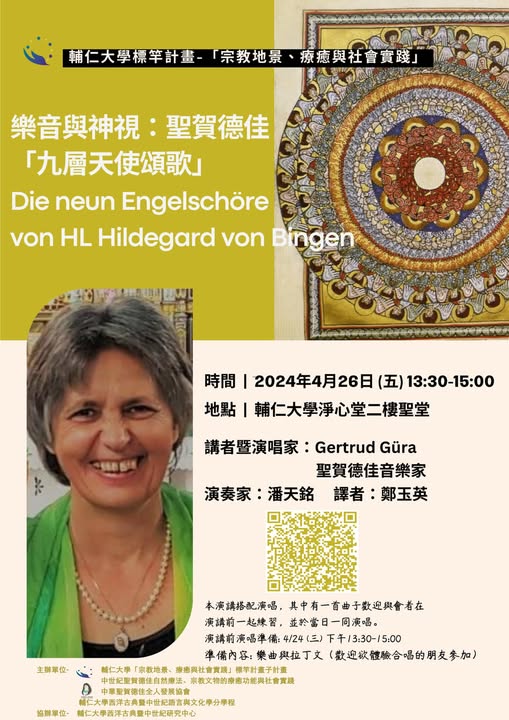 【演講】樂音與神視:賀德佳「九層天使頌歌」Die neun Engelschöre von HL Hildegard von Bingen 演講暨演唱者:Gertrud Güra (德國聖賀德佳演唱家) 時間:2024年4月26日(星期五)13:30-15:00 地點:輔仁大學淨心堂二樓聖堂 More info 專題演講